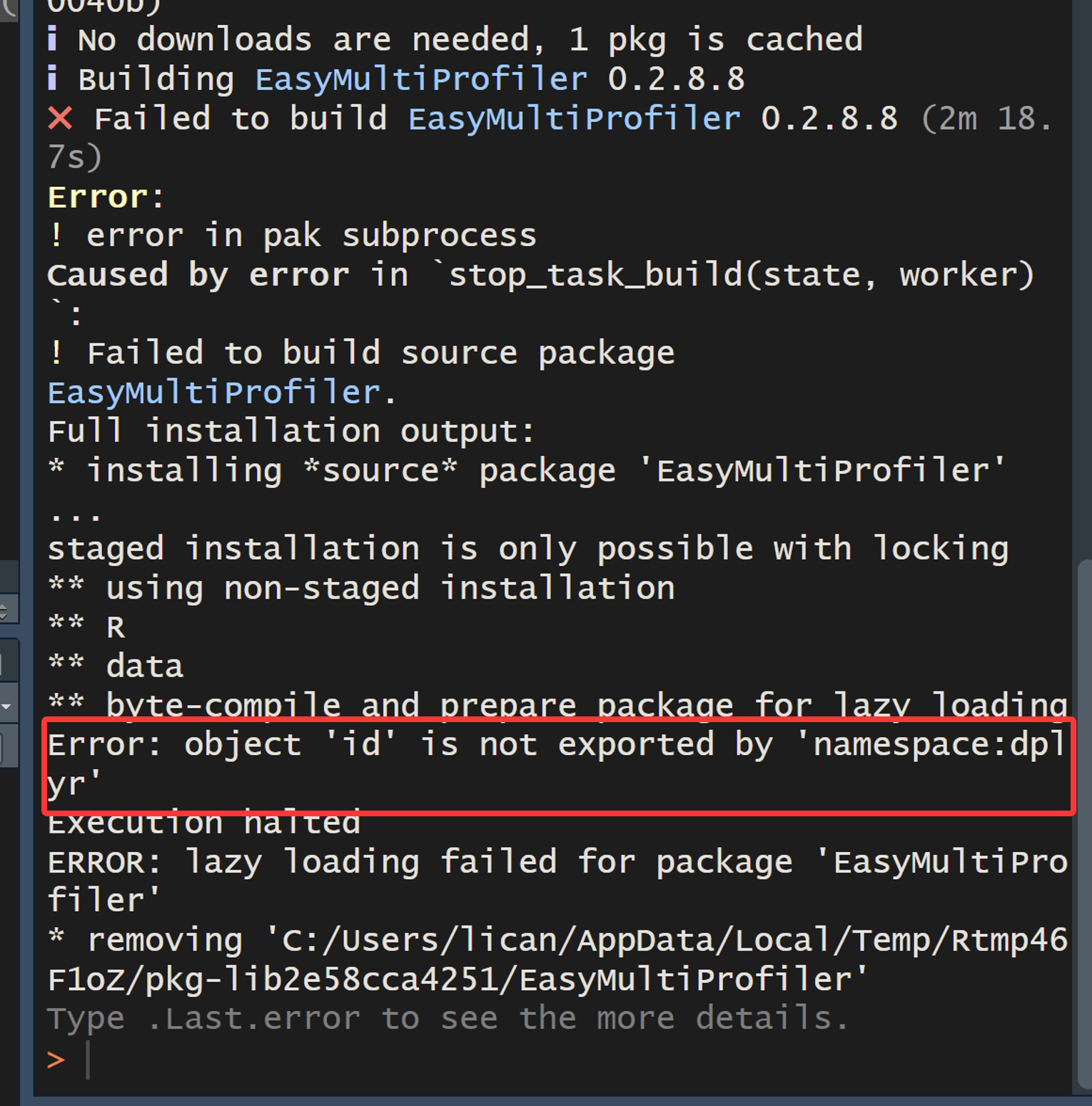 EasyMultiProfiler依赖多种R包,因此在安装过程中可能会出现环境依赖冲突等问题。本章节介绍了常见的安装错误及解决办法。