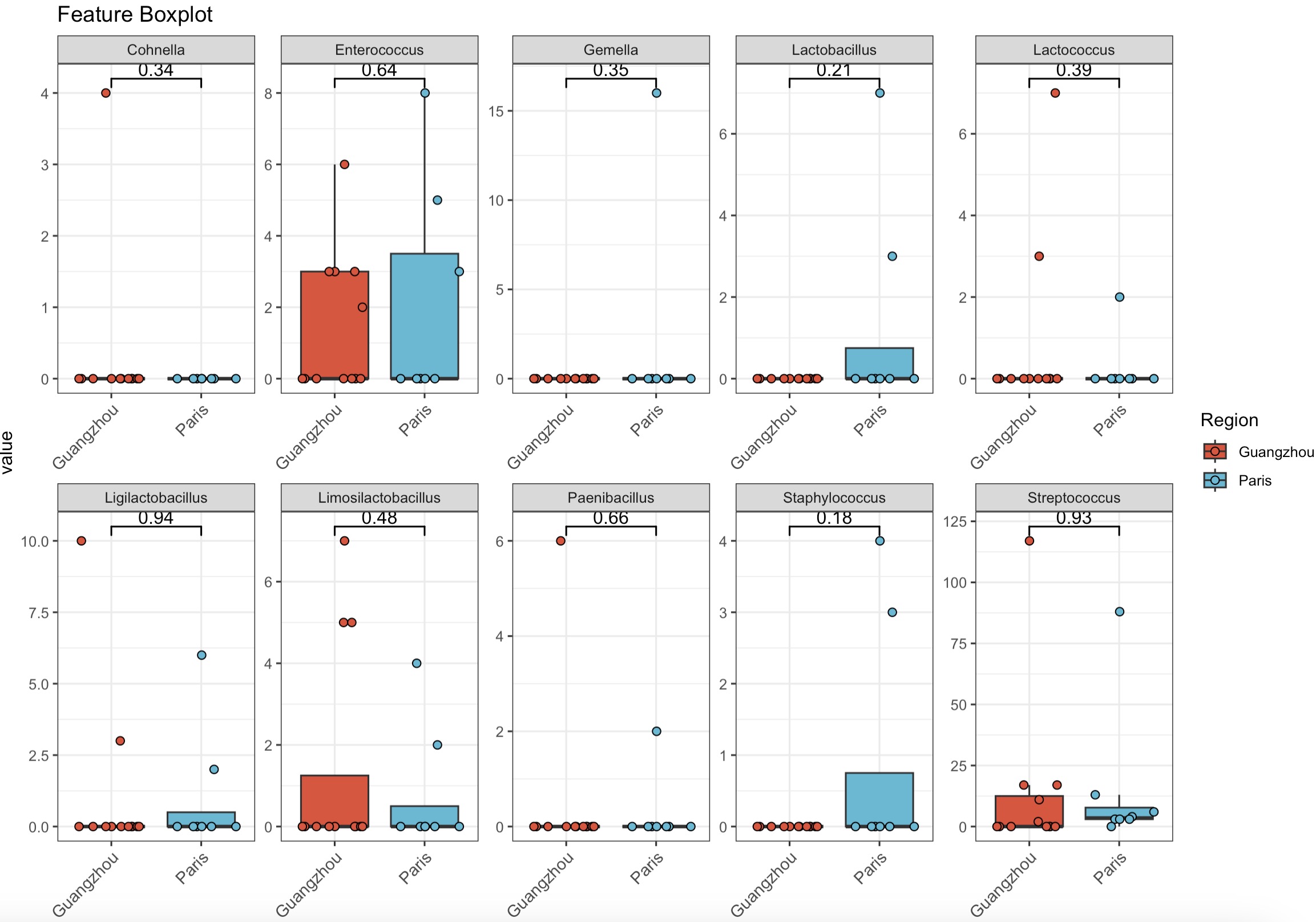 查看Bacilli纲级别下的菌属,并按照区域分组进行统计学检验