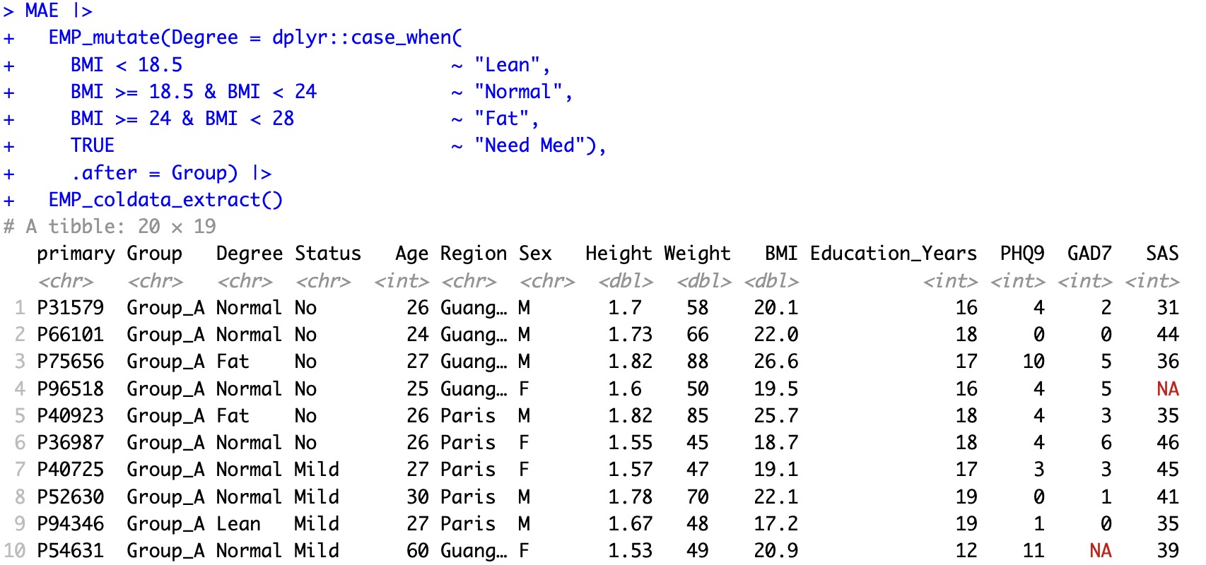 The EMP_mutate module is highly versatile, allowing transformations not only based on assay, rowdata, and coldata of a dataset, but also on the results of data analysis. To help users better understand its usage, the basic parameters of the module are described below: