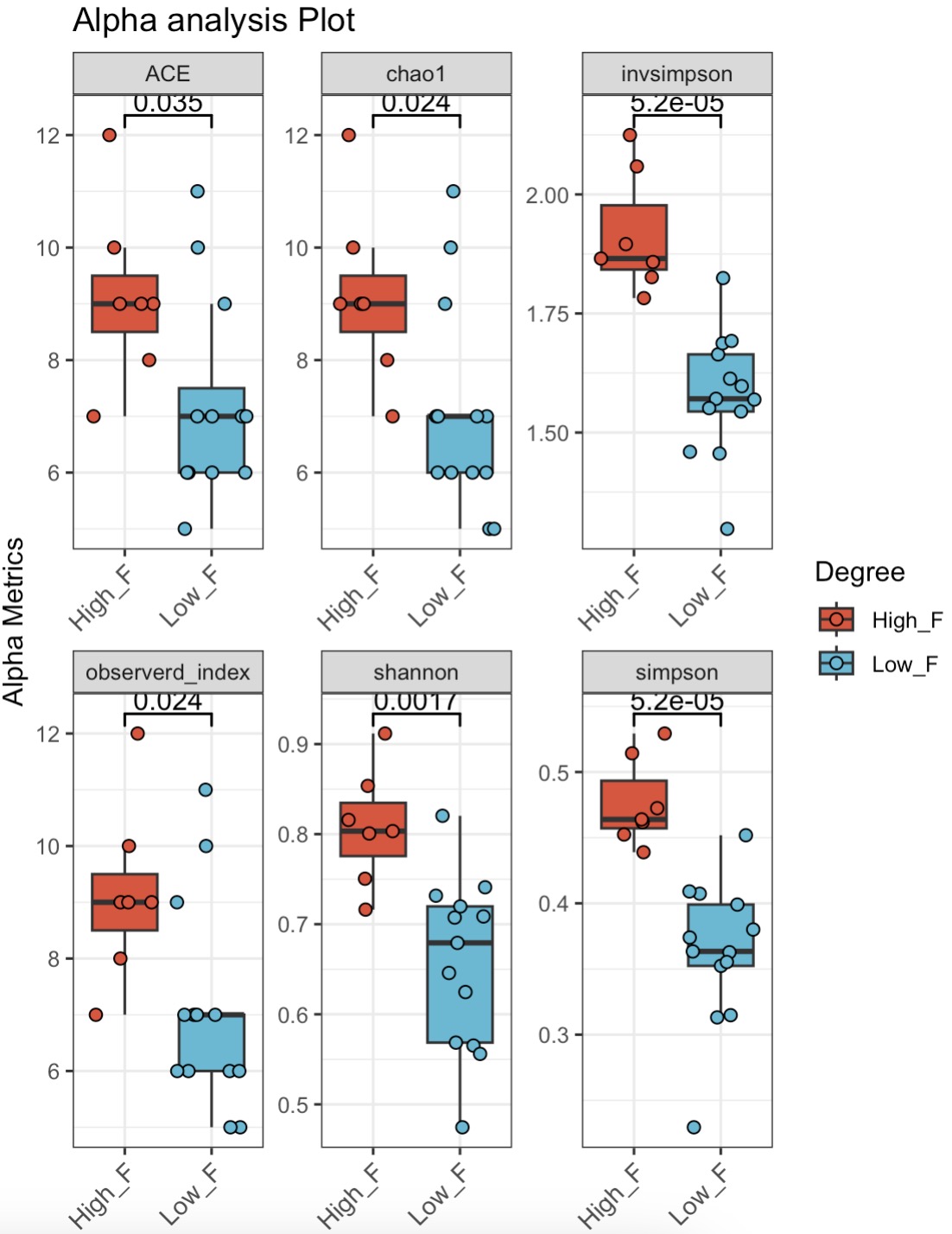 🏷️Example3:Grouped by Firmicutes abundance levels and compared for alpha diversity.